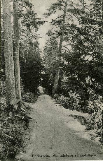 Tryckt text på vykortets framsida: "Uddevalla, Gustafsberg strandvägen."