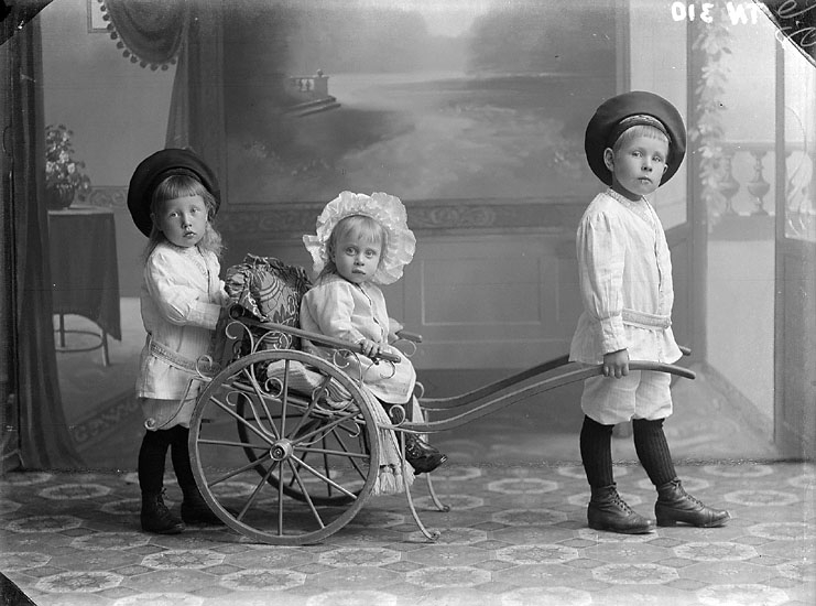 Enligt senare noteringar: "Ateljéfoto av tre barn, varav det mindre sitter i en lekkärra. Fr.v.: Erik Nilsson (1908- ), Nils Nilsson (1909- ), Herbert Nilsson (1906- )."