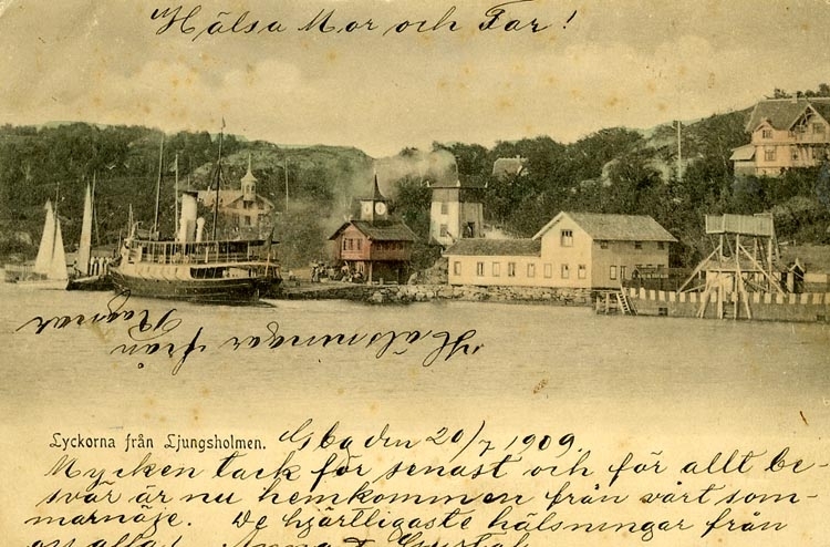 Enligt Bengt Lundins noteringar: "Lyckorna från Ljungholmen. SS Kung Rane med segelbåtar vid ångbåtsbryggan".