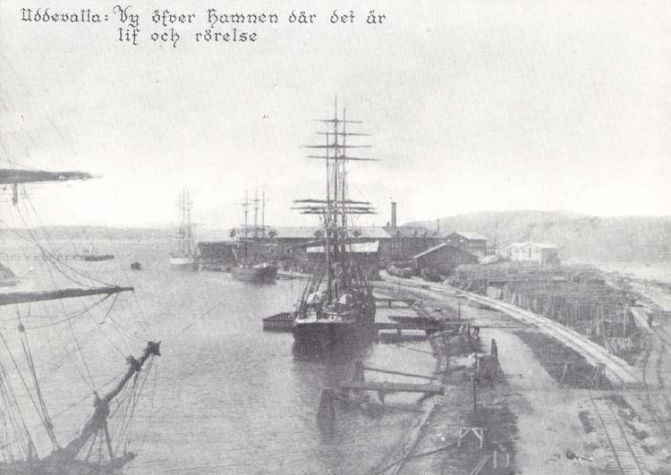 Tryckt text på kortet: "Uddevalla. Vy öfver hamnen där det är lif och rörelse."