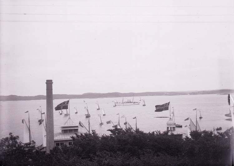 Vid H.M. Konung Oscar II ankomst till Lysekil. Kungajakten Drott efter ombyggnaden 1901. Segelbåtar. I förgrunden varmbadhuset.