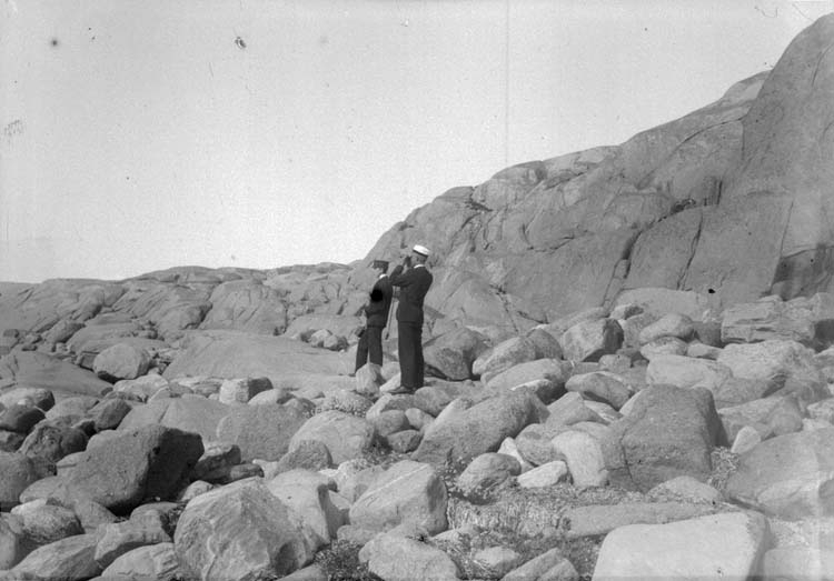 Enligt text som medföljde bilden: "Eric och Calle vid Kramkistesund. Lysekil. Stångehufud 17/9 1899. Hugo Hallgren."