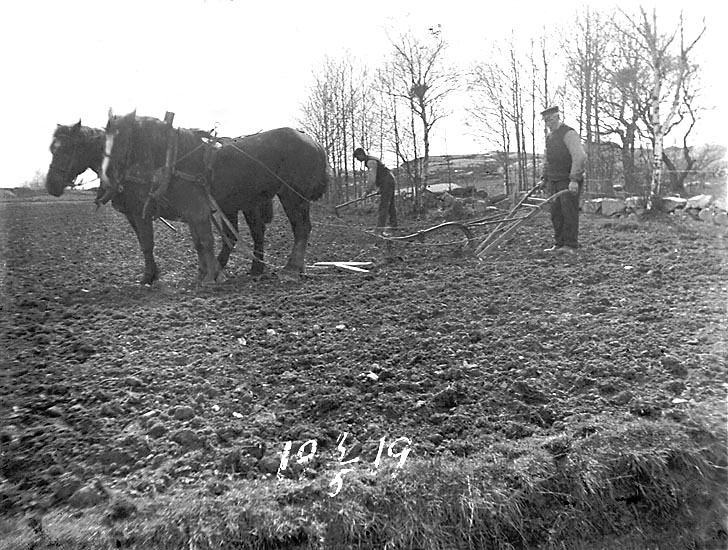 Enligt noteringar: "Vårplöjning. Johan Johanssons hem. Vid plogen Johannes A. - J.J. hackar, 3 maj 1919."