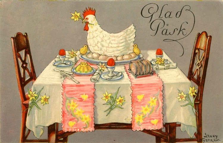 "Glad Påsk tillönskas Id Sandelin" noterat på kortet. Bord dukat till påskfest.