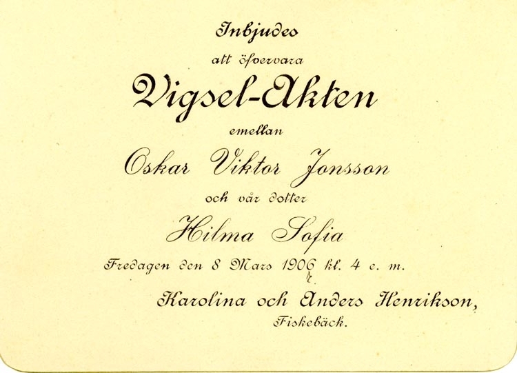 Text på kortet: Inbjudes att öfvervara Vigsel-Akten emellan Oskar Viktor Jansson och vår dotter Hilma Sofia Fredagen den 8 Mars 1906 kl. 4 e.m. Karolina och Anders Henrikson, Fiskebäck.