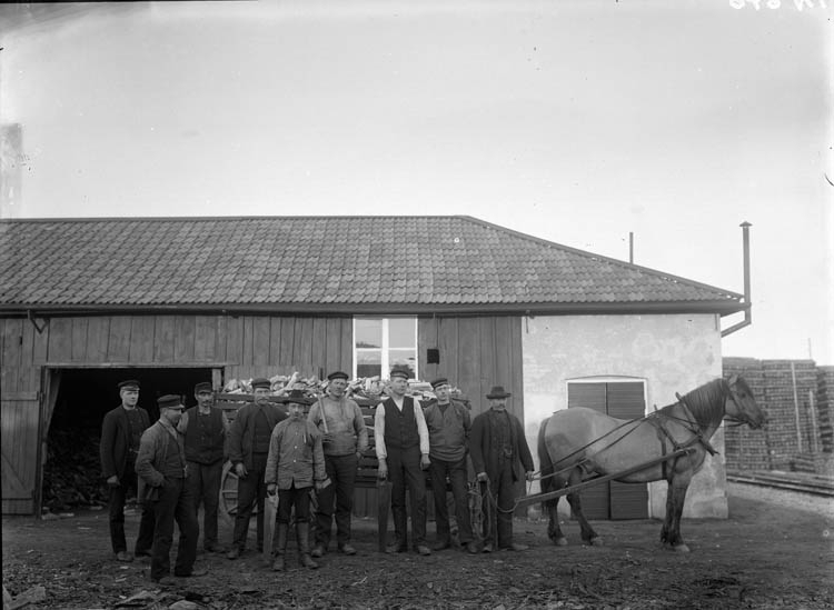 Enligt tidigare noteringar: "Arbetare, varav några med snickarverktyg, framför hästfordon lastad med ved."