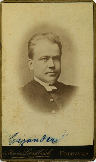 Text på kortets baksida: "Kyrkoherde Gottfrid Cajander. Pastor Cajander kom. i Lane-Ryr. Kyrkoherde i Foss, f. 1851. Huvudman i U-a Sparbank 1893-96. Stadsfullmäktiges ordförande 1893-94".
