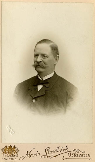 Text på kortets baksida: "Direktör John Pettersson, f. 27/11 1834 d. 9/4 1912. S. F. 1869 1908".