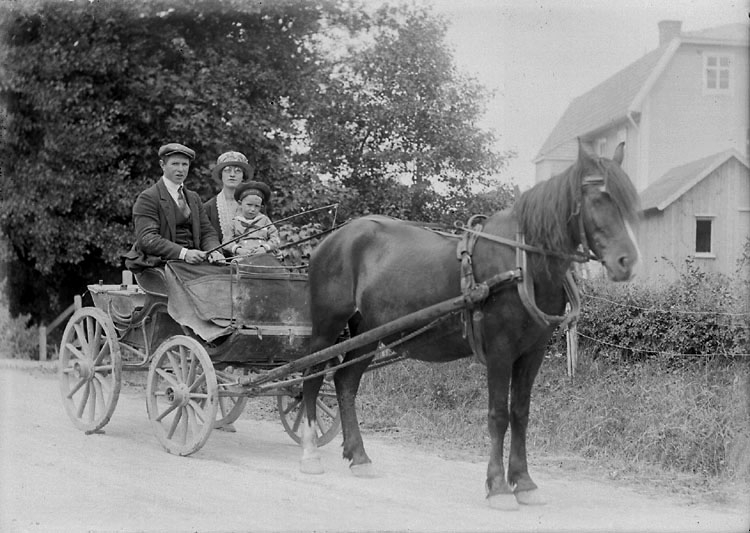 Enligt noteringar: "Familj i åkvagn utanför Oscar Färdigs bostad. Huset i bakgrunden är Nordbergska stiftelsens slöjdskola."
