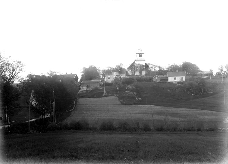 Enligt noteringar: "Bilden tagen från norr, bredvid vägen mot prästgården och Kampstorp. Huset till vänster med två skorstenar är Foss kyrkskola. Vid bergknallen, nedanför ingången till kyrkan, anses vara den plats kung Östen stod lik efter dråpet 1157." (BJ)