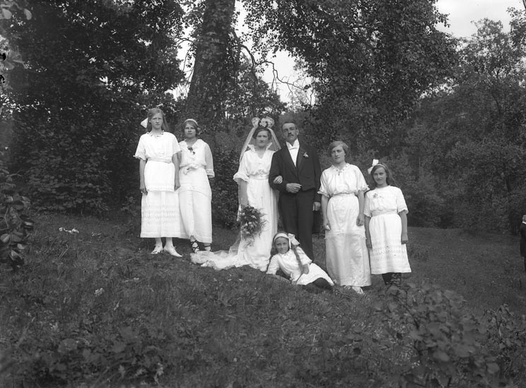 Enligt fotografens noteringar: "Omkring år 1912? Brudpar Bjelke. Bruden Astrid. Bröllop i Kvistrum."