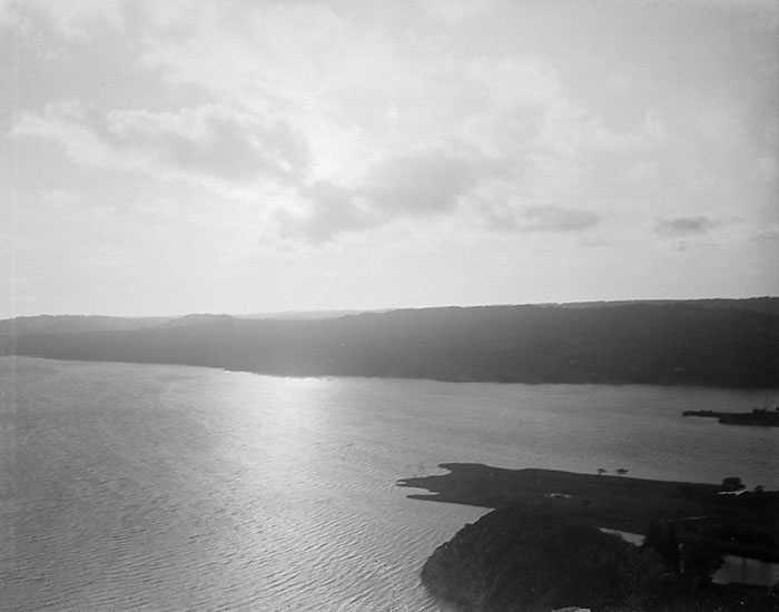 Enligt senare noteringar: "Inloppet till Munkedals hamn från Rödberget på Saltkällesidan. Vid kajen ligger ett lastfartyg och lossar eller lastar för Munkedals bruks räkning." (BJ)