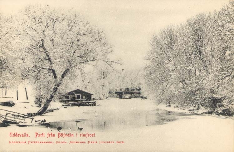 Tryckt text på kortet: "Uddevalla. Parti av Bäfveån i rimfrost."