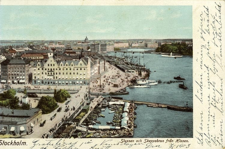 Notering på kortet: Stockholm. Slussen och Skeppsbron från Hissen.