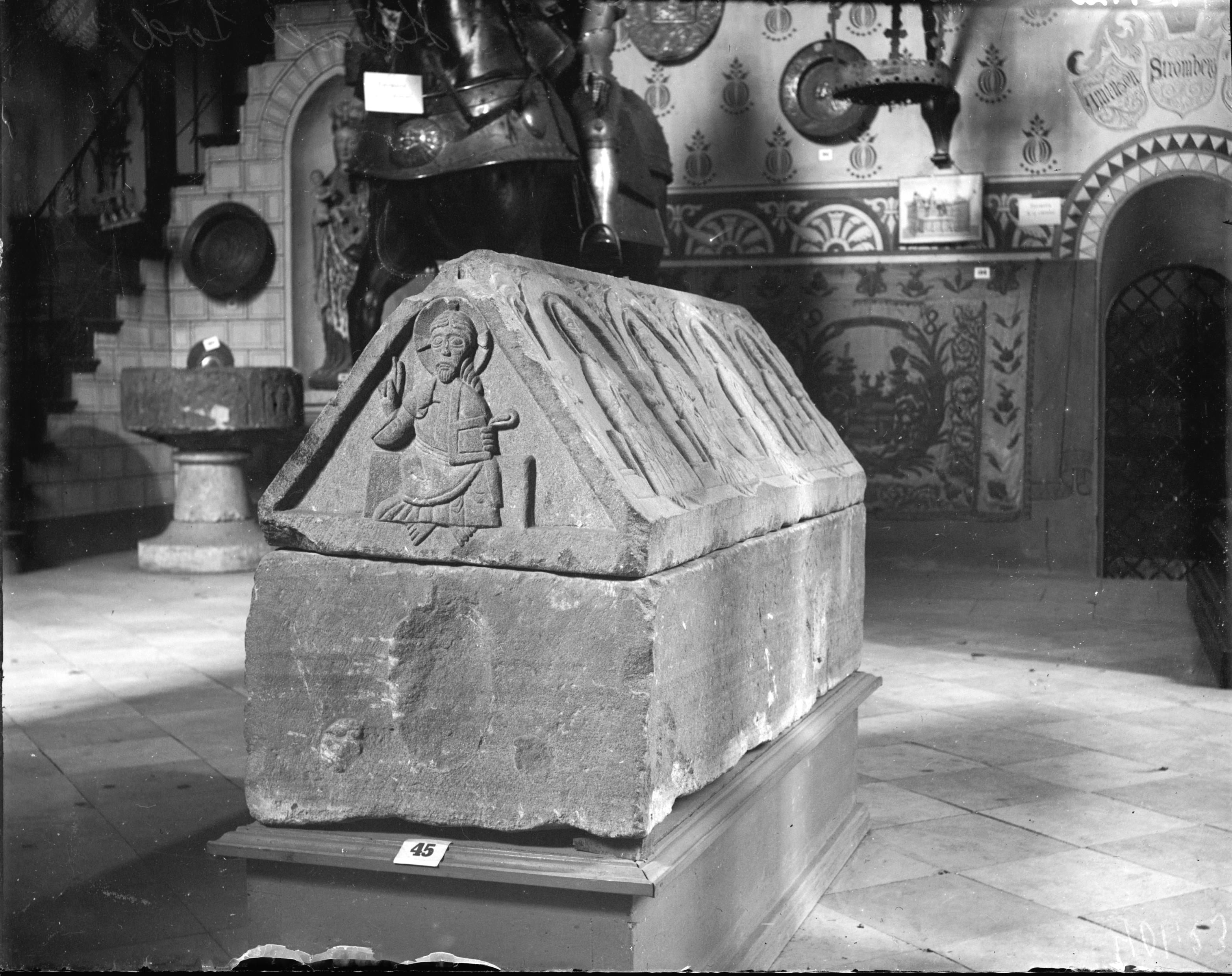 Relikskrin, huggen sandsten, locket smyckat med figurer i låg relief, utförd 1170-80 av anonymmästaren Majestatis.