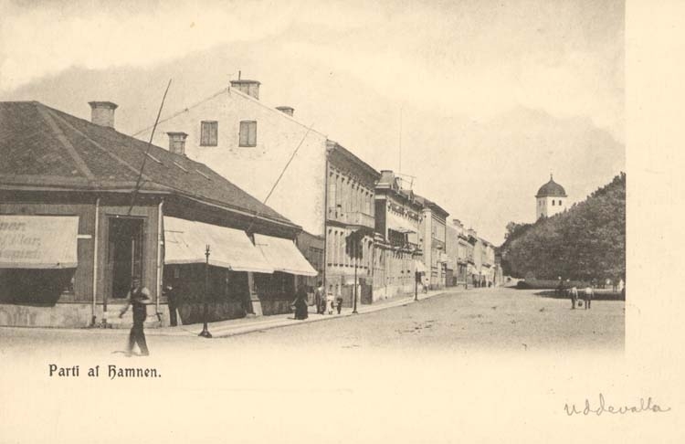 Tryckt text på kortet: "Uddevalla. Parti av hamnen."