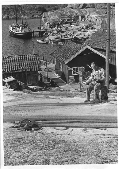 Enligt tidigare noteringar: "Sjöviken, Hamburgö, hamn med sjöbodar vid brygga kuttern "Alfhild", man med nät.