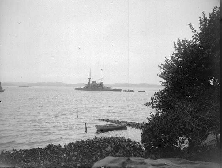 Enligt text som medföljde bilden: "Pansarbåten Oden tagen från vår veranda. Lysekil