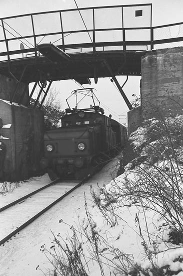 Text till bilden: "Tåget passerar under den lilla bron som låg öster om Hedegärdebron. Motorvägen går där loket passerar. Bilden finns med i bok om U-a del 4 sid 63" . Album 9 bild 61.