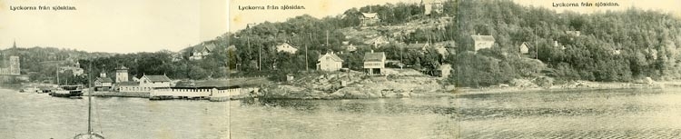 Enligt Bengt Lundins noteringar: "Lyckorna från sjösidan. 3-Delat panoramakort".