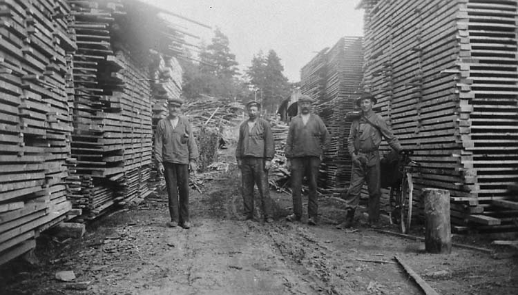 Enligt medföljande text: "Detta foto visar när stockarna har sågats till bräder och plank vid Stöttens sågverk och upplagts av Albert Alfredsson, Bergetorpet. Gustaf, Johannes och Albin. "När jag betraktar dessa 10 fotografierna så är det endast ett fåtal av dessa dugliga arbetare som lever år 1976. Frid över deras minne!".