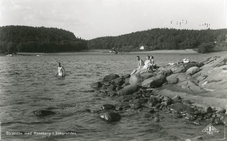 Enligt Bengt Lundins noteringar: "Strandön med Raneberg i bakgrunden. Badare".