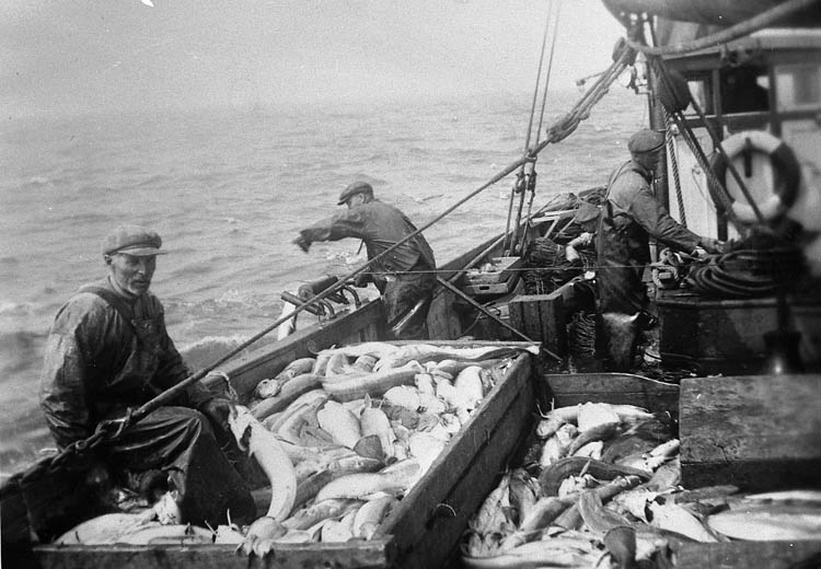 Enligt tidigare noteringar: "Ombord på LL 59 "Olive" av Grundsund. Pågående backfiske vid Shetlandsöarna, sittande på relingen Anders Gullman, vid relingen Hjalmar Gullman och vid vinschen Paul Gullman, Helmer Hilmersson bakom Paul Gullman, i styrhytten John Nilsson.
