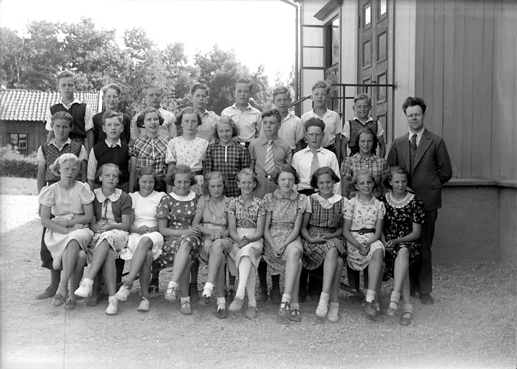 Enligt senare noteringar: "Läraren är Harry Karlsson (1898-1977), som inflyttat från Östergötland i mitten på 1930-talet. Harry Karlsson pensionerades i mitten av 1960-talet. Mellersta raden: nr 4 Inger Olsson (Brink), nr 5 Nancy Pettersson (Hedlund), nr 6 Olof Norberg, .