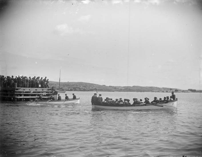 Enligt text som medföljde bilden: "Lysekil. Tvenne skeppsbåtar med skeppsgossar vid ångbåtsbryggan 24/6 1899".
