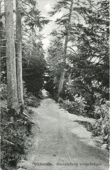 Tryckt text på vykortets framsida: "Uddevalla. Gustafsberg. Strandvägen."