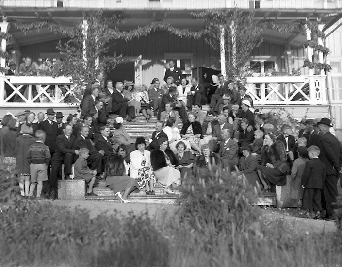 Enligt senare noteringar: "Människor på trappan till herrgården, Torreby." (BJ)