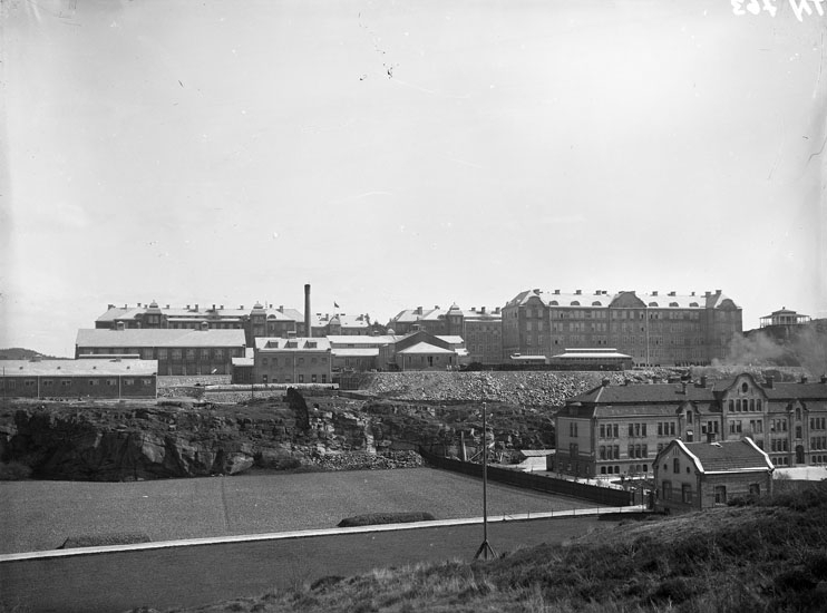 Enligt tidigare noteringar: "Bohusläns regementes kasernbyggnader från sydväst."