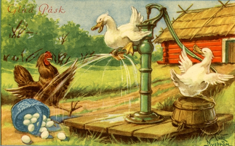 Kort: Glad Påsk". Ankor som skvätter vatten från en handpump på en höna med en korg innehållande ägg.