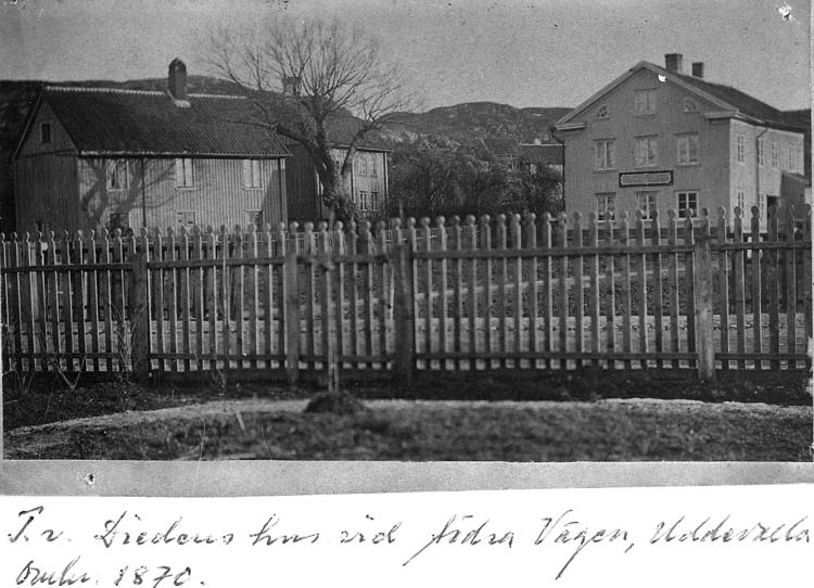 Text på kortet: "T.v. Diedens hus vid Södra Vägen, Uddevalla, omkr. 1870".