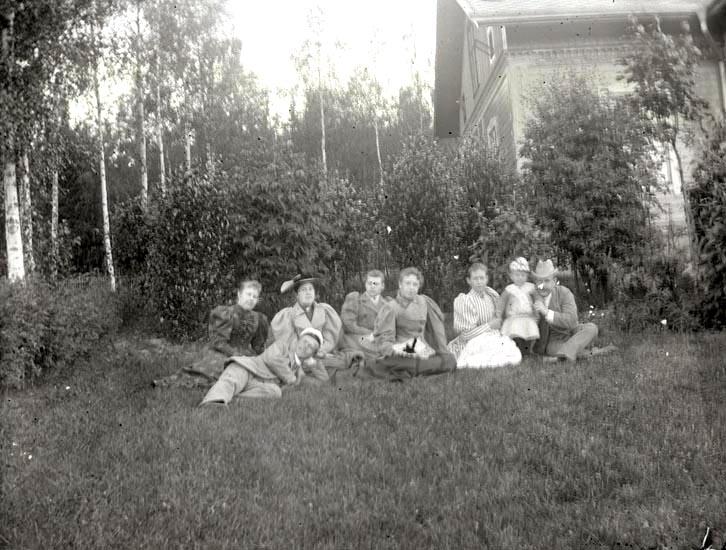 Ungdomar vid "stugan" den 28 juni 1894. Bästa plåten, som är skafd i ena hörnet.