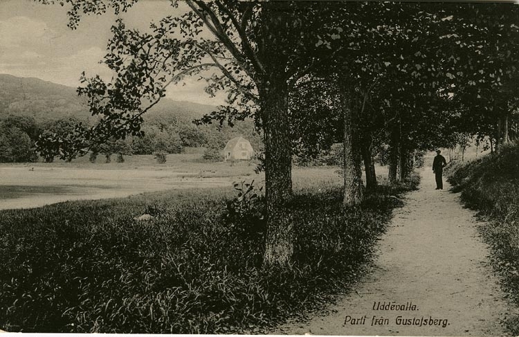 Tryckt text på vykortets framsida: "Uddevalla. Parti från Gustafsberg."