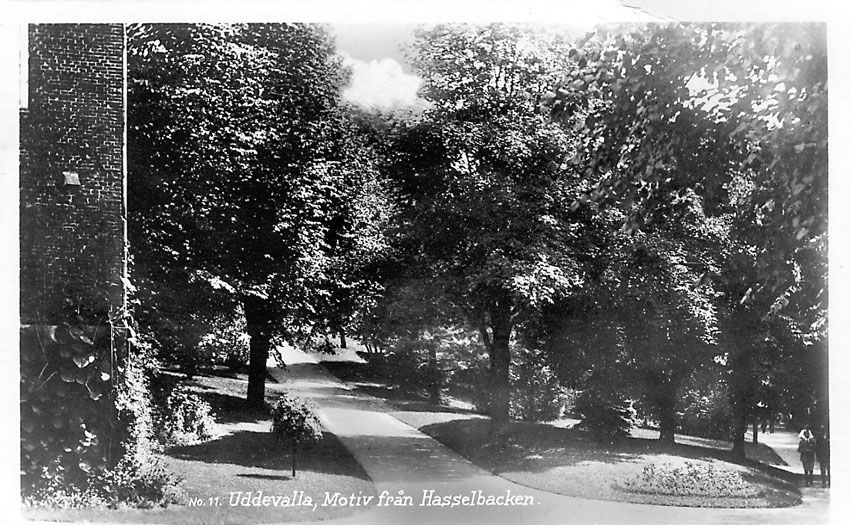 Tryckt text på vykortets framsida: "Uddevalla. Motiv från Hasselbacken".