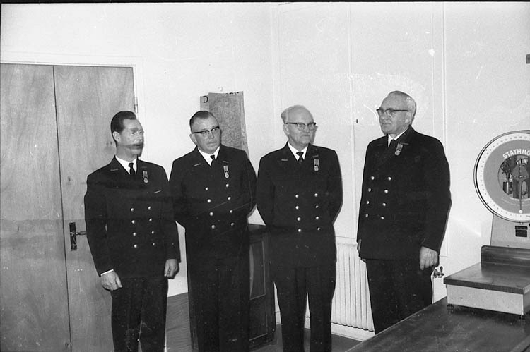 Enligt fotografens notering: "Tulltjänstemän medaljerade i Lysekil, Fr. v. Tullöveruppsyningsman Erik Svensson, Lysekil. 1:e Tulluppsyningsman Manfred Larsson, Smögen. Tullmästare Erik Eriksson, Marstrand. 1:e Tulluppsyningsman Harry Rosén, Lysekil".