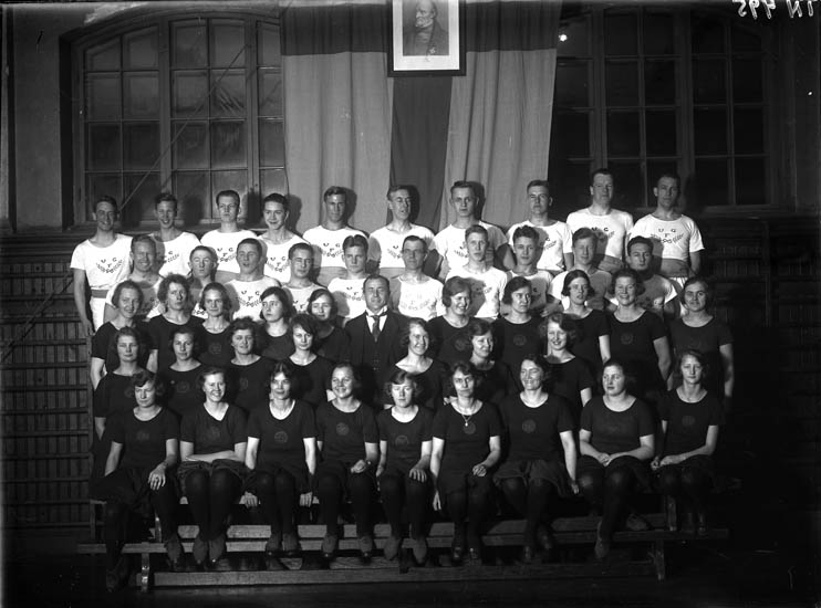 Enligt tidigare noteringar: "Gruppfoto i gymnastiksal på manliga gymnaster UGF och Kvinnliga GF."