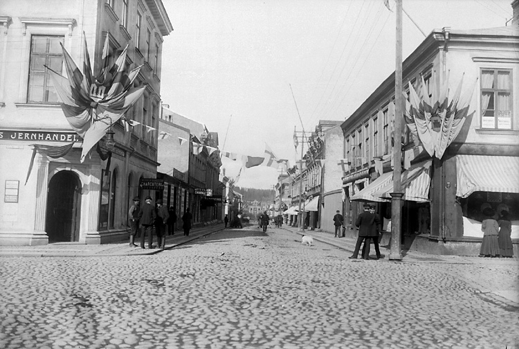 Enligt tidigare noteringar: "Kungsgatan, Uddevalla västerut från torget, flaggor och stadsvapnet på husen. 2