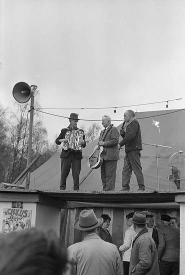 Text till bilden:"Två populära spelmän på Rabbalshede marknad 1964, "Västgöta-Sigge" och Johan Edvardsson eller "Glade pelle".Samhör med bild 37 ialbum 3.