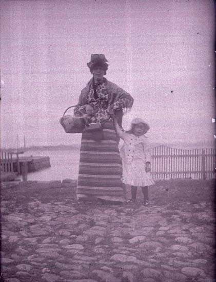 Lilly Lycke står på kajen i Lysekil med ett litet barn.