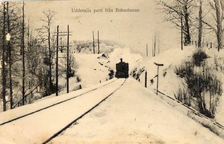 Tryckt text på vykortets framsida: "Uddevalla parti från Bohusbanan"
