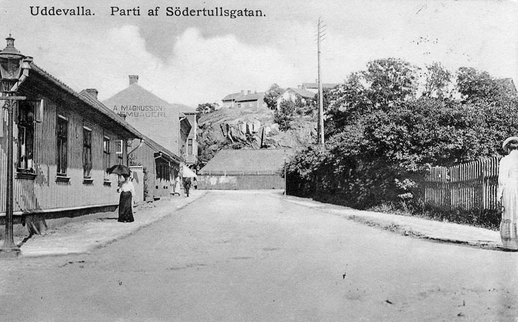 Tryckt text på vykortets framsida: "Uddevalla. Parti af Södertullsgatan".