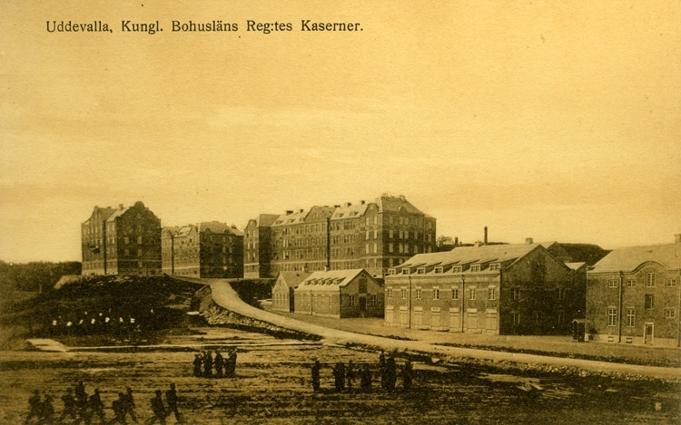 Text på kortet: "Uddevalla. Kungl. Bohusläns Reg:tes Kaserner".