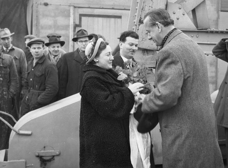 Sjösättning och dop av fartyg 113 M/T Islas Georgias. Fartygets gudmor tar emot en blombukett.
