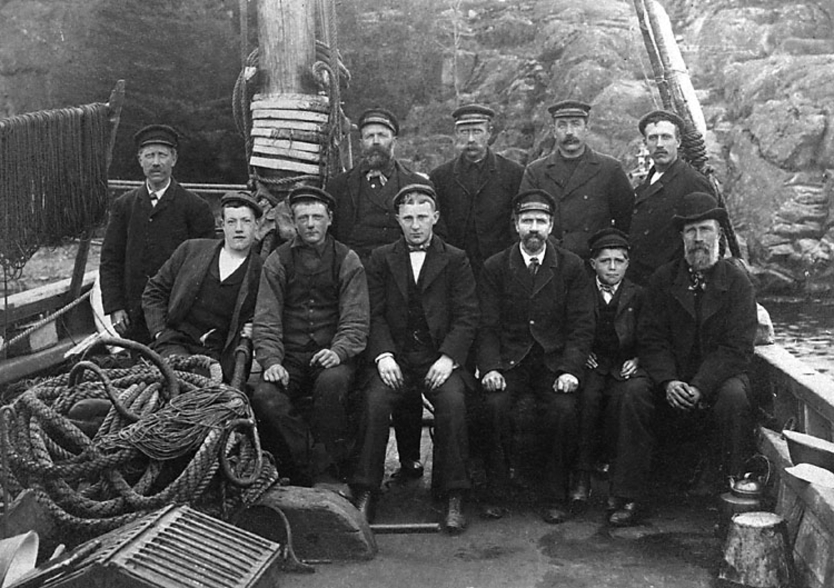 Kopia finns 10x15 (B.M.A.). Storbacke- och dörjelaget på kuttern Restless - Wave omkring 1910. Namn se kopian.