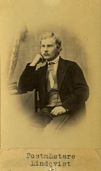 Text på kortets baksida: "Postmästaren Johan August Lindqvist. f. 1835. Marstrand 1864".