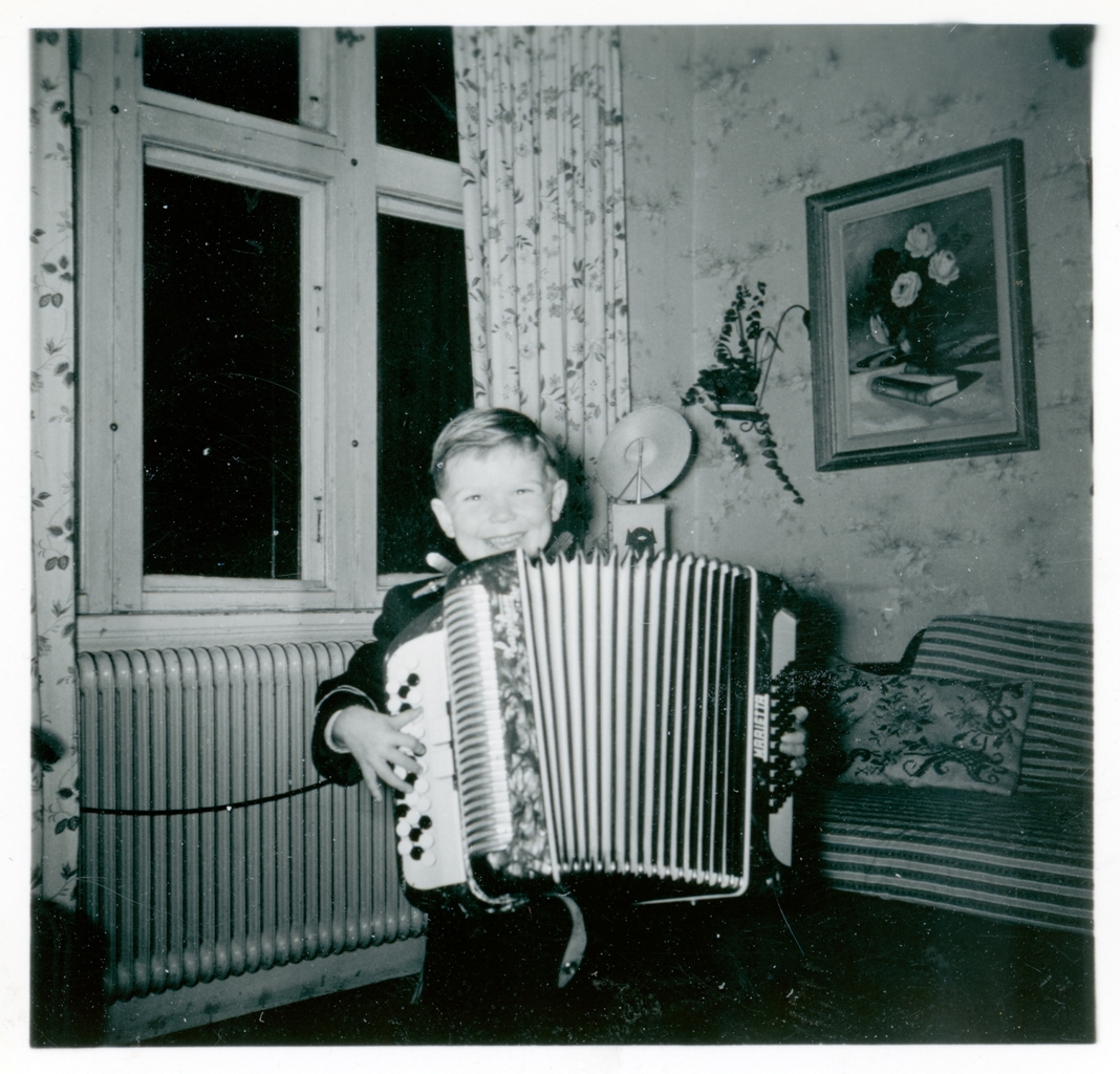 En pojke spelar på ett dragspel. Han ler mot kameran.