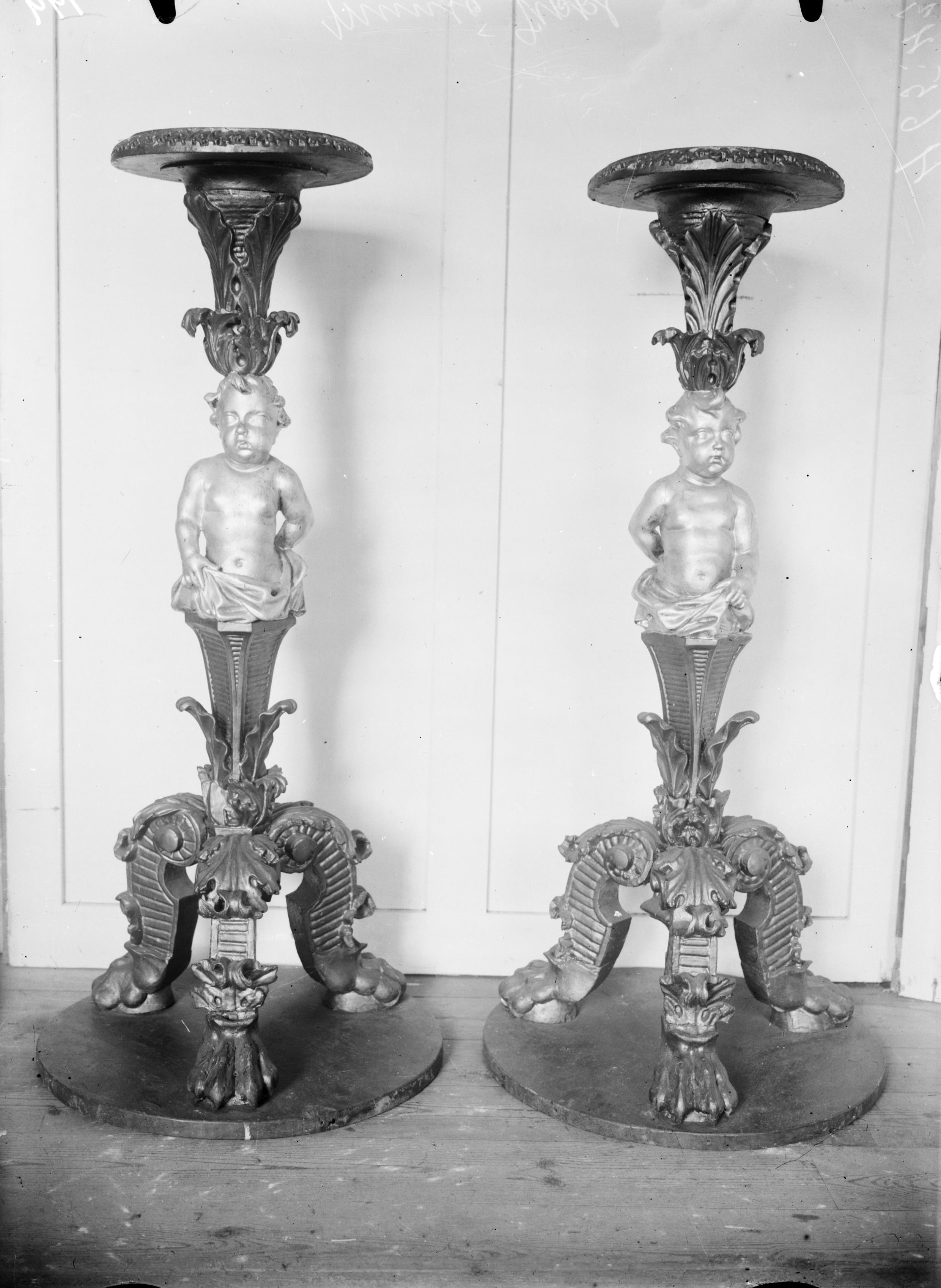 Guéridon, ett par, förgyllt trä med herm i gossgestalt, står på tre djurfötter, början av 1700-talet. Gåva av Johan Jansson Teller 1787.